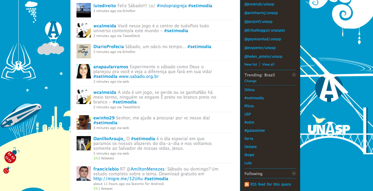 Robson Fonseca, que é estagiário do departamento de marketing do Unasp-EC e responsável pelas redes sociais, se surpreendeu com o resultado obtido. “A repercussão foi muito maior do que a esperada. Quando vi que já estávamos nos Trending antes do horário do pôr-do-sol de sexta-feira fiquei muito feliz. Mas o mais legal foi ver os jovens empolgados em divulgar o que acreditam e responder dúvidas de pessoas curiosas para entender o que era esse tal de “setimodia” tão comentado”. Além das mensagens no Twitter, mais de 20 blogs e sites divulgaram o movimento.